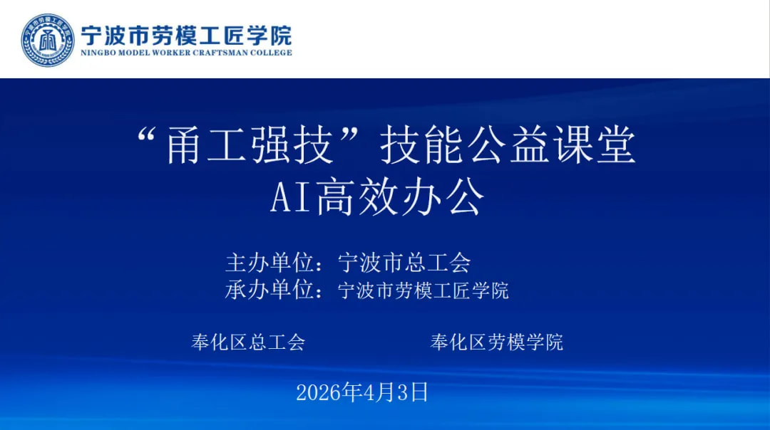 为紧跟数字化时代发展浪潮,提升公司员工智能办公技能与工作效率,推动人工智能技术与日常工作深度融合,4月3日下午,由奉化总工会组织的人工智能应用培训活动,在我司顺利开展。公司各部门员工代表及尚田街道其他企业代表积极参与此次活动。