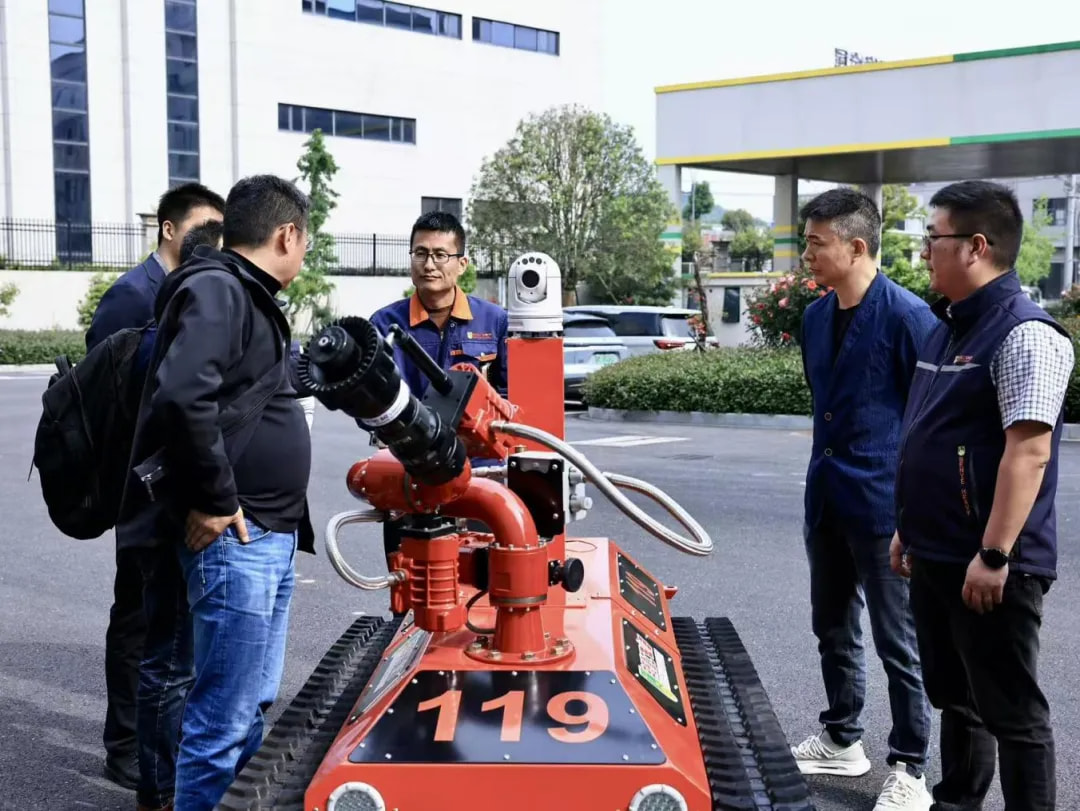 在安防机器人实操体验环节,考察团成员亲身上手操作设备,近距离感受其在复杂场景下的灵活机动性、精准灭火性能与智能操控优势,对奔野重工将成熟底盘技术与智能控制技术结合的创新思路赞不绝口。